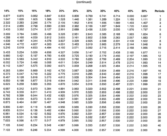 The present value of the cash inflow can be determined from Table A-4 by using 20% annual interest rate as shown below. |