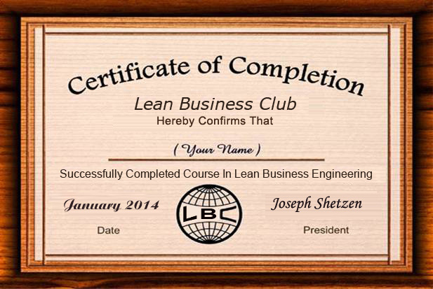 This test is entirely optional and upon its successful passing (minimum passing grade is 80%) you will receive a Certificate Of Completion In Lean Business Engineering from Lean Business Club by mail and a professional designation of a Registered Lean Business Engineer (RLBE). A sample of the Certificate Of Completion is illustrated below.