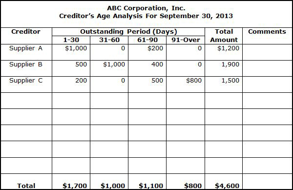 It is essential to identify all accounts payable by the company to its suppliers, or trade creditors, and to summarize them in monthly Creditors Age Analysis Reports in accordance with the outstanding periods of time. These reports enable the financial manager to evaluate and control the level of accounts payable in accordance with the specific requirements of the company.
