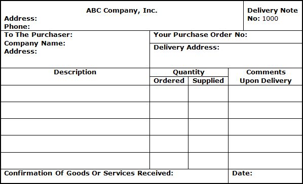 Receiving department returns a signed copy of delivery note to supplier as proof of delivery. |
