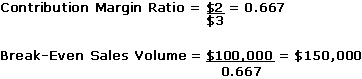 If, conversely, the sales are 10 percent below the break-even volume, then the company will sell only 45,000 units and this will cause a loss of 5,000 units x $2 = $10,000. |
