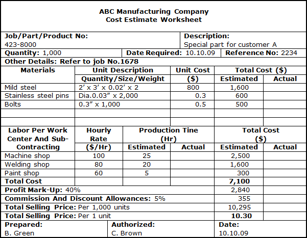 Irrespective of the costing method used, the standard cost estimating procedure necessitates a thorough understanding of all material, labor, operational capacity, and sub-contracting service requirements. These requirements should be identified and summarized in a Cost Estimate Worksheet. A typical illustration of a Cost Estimate Worksheet is presented below.