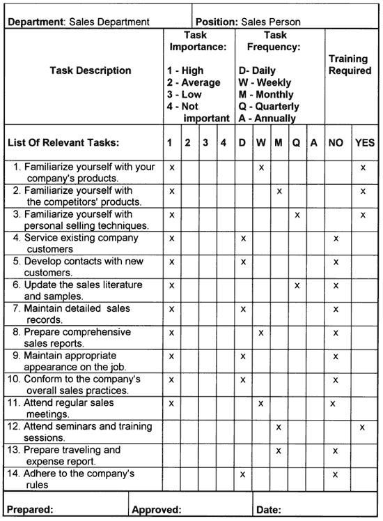 Some employers use a Task Analysis Checklist for determining training needs of new employees. The Task Analysis Checklist summarizes information pertaining to a specific job and becomes the basic reference point for determining specific training requirements. |