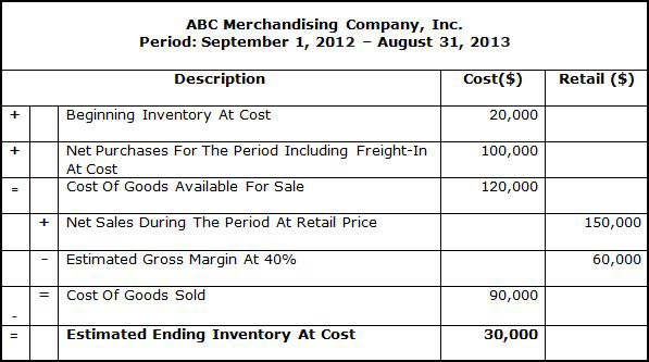 The Retail Method is generally used in retail merchandising organizations. The use of this method is based on the availability of inventory values at the beginning of the period at cost and at retail, i.e. the original cost and marked-up selling price. Additional records, which are required, include the value of new purchases and net sales during the period.