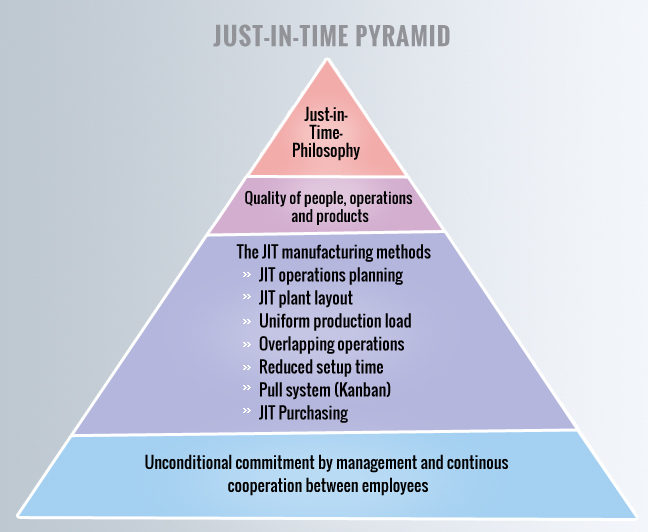 Just-In-Time Methodology represents an integral part of Lean Organization and it can be visualized as a pyramid as illustrated below.