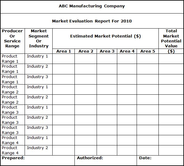 As a result of market measurement and forecasting procedures, the marketing manager will be able to summarize important information in a Market Evaluation Report. A typical illustration of this report is presented below. |