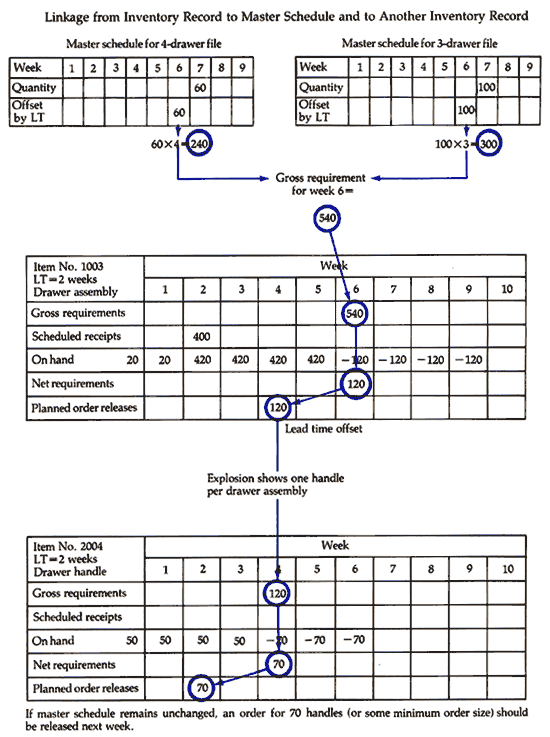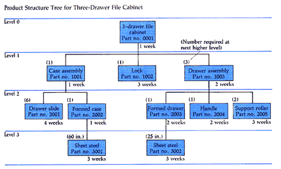 The action of the MRP system cuts across all levels of the Product Structure Tree and converts Gross Requirements of the Master Production Schedule into Net Requirements for individual components. The conversion of such requirements is illustrated below. |