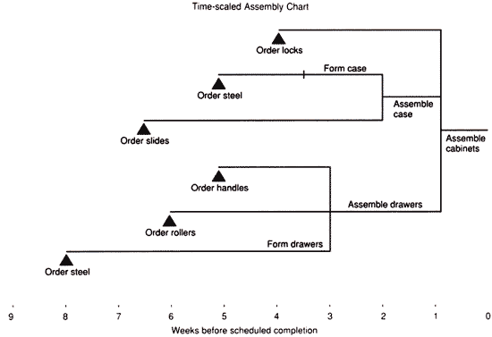 A typical Time-Scaled Assembly Chart for the three-drawer file cabinet is presented below. |
