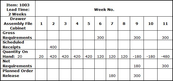 Since the Lead Time for the drawer assembly is two weeks, the Net Requirements must be scheduled two weeks ahead. Thus, the Planned Order Release of 180 is entered in Period 7 to meet the above manufacturing requirements. |