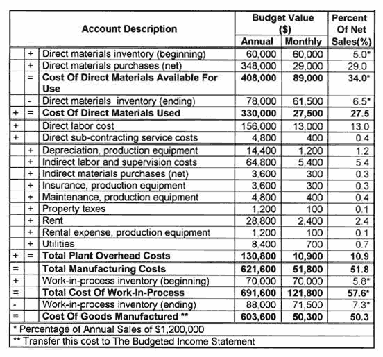 This budget, also known as the Cost Of Goods Manufactured Budget, includes the estimated net cost of all direct (raw) materials purchases, direct labor, and sub-contracting service costs, total plant (see note below) overhead costs, and the difference between estimated inventory (raw materials and work-in-process) values at the start and at the end of the budgeted period. |