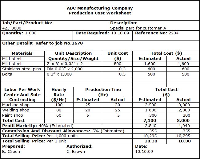 If the actual costs exceed the estimated costs, the client will still expect to be charged the price, based on the estimated costs, and any additional costs should be absorbed by the company. Conversely, if the actual costs are below the estimated costs, this could be kept by the company as an additional profit or passed on as an additional discount to client. More details related to Production Cost Control in a manufacturing environment are discussed next. |
