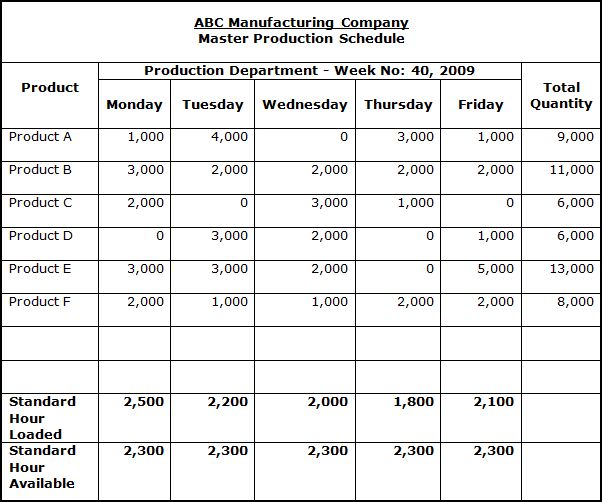 A master production schedule, illustrated below, is usually prepared on a weekly, bi-weekly, or monthly basis, depending on the nature of manufacturing activities.