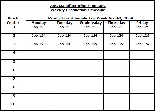 Among the most important tools for production scheduling is graphical display of work allocation in various work centers. Such a display, or Weekly Production Schedule, provides an effective indication of Workload Status within the operations department on a weekly basis. This schedule, based on a Gantt Chart presentation which was discussed earlier, is illustrated below.