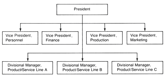 Many medium-sized and larger multi-product and multi-service companies are departmentalized according to a product or service organizational structure. In a company departmentalized by product or service, all product or service lines are grouped into separate divisions as illustrated below. |