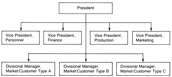 A large manufacturing company, for example, might have separate divisions for different types of markets (e.g. industrial or consumer), or for customers in different industries (e.g. chemical or engineering) as illustrated next. |