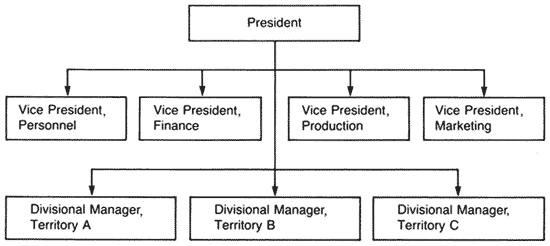 A large manufacturing company, for example, might have separate divisions in East Coast and West Coast regions, or in different countries. Typical departmentalization by territory is illustrated below. |