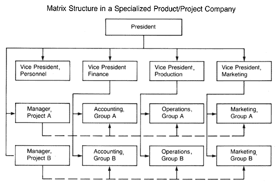 There is, however, a third type of organizational structure which combines the advantages of both functional and divisional structures. This structure, illustrated below, known as a Matrix Structure, is frequently applied to specialized product or project organizations. |