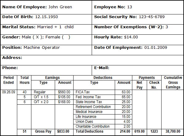 An example of a typical Employee Earnings Record is presented below. This record reflects all details pertaining to three elements of employee compensation outlined below. |