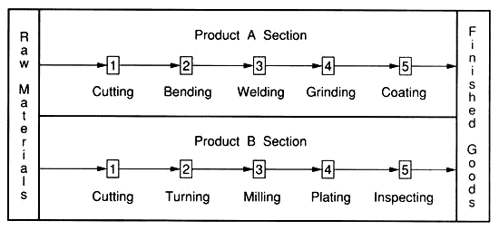 This example illustrates plant layout consisting of two product sections, Product A and Product B. Each section has a certain number of specialized machinery and equipment which provide all operations required by a particular manufacturing process.
