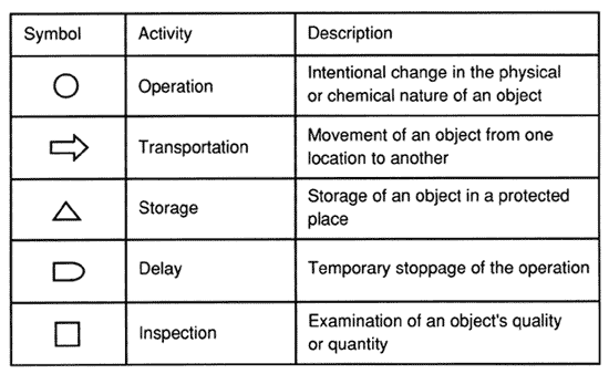 There are five types of activities identified in a manufacturing environment. Each type of activity is marked with its appropriate symbol and illustrated below. |