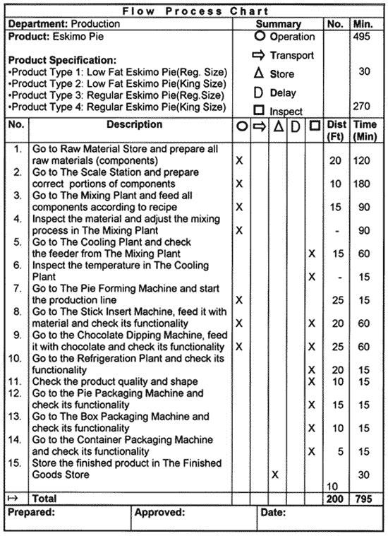 The illustrated production process flowchart specifies the time requirement for various operations in case of the Eskimo Pie manufacturing and provides the time summary of various processes. |