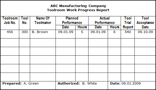 Detailed information related to each tool manufacturing job should be recorded in a Toolroom Work Progress Report. A typical illustration of a Toolroom Work Progress Report is presented below. |