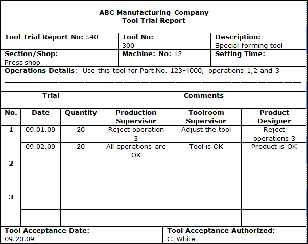 Once the new tool is tested in the manufacturing environment, appropriate comments by the production, toolroom, and design office employees need to be summarized in the Tool Trial Report. Only with their approval can a particular tool be accepted for routine production runs.