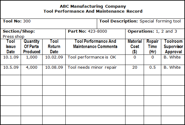All records related to operational performance of a particular tool need to be summarized in the Tool Performance And Maintenance Record. A typical illustration of a Tool Performance and Maintenance Record is presented below. |